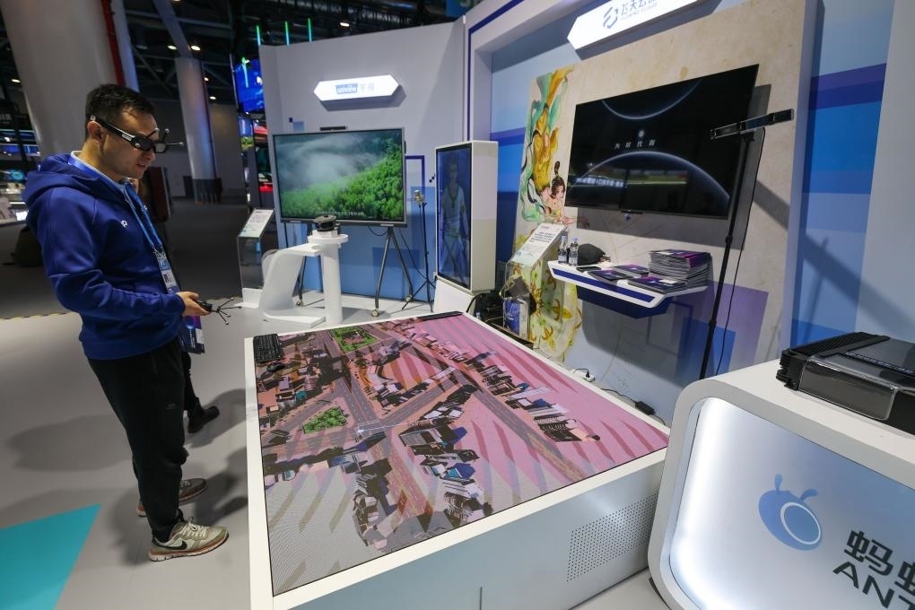 11月23日,在第二屆全球數(shù)字貿(mào)易博覽會上,參觀者戴上VR眼鏡漫游虛擬城市。新華社記者 徐昱 攝