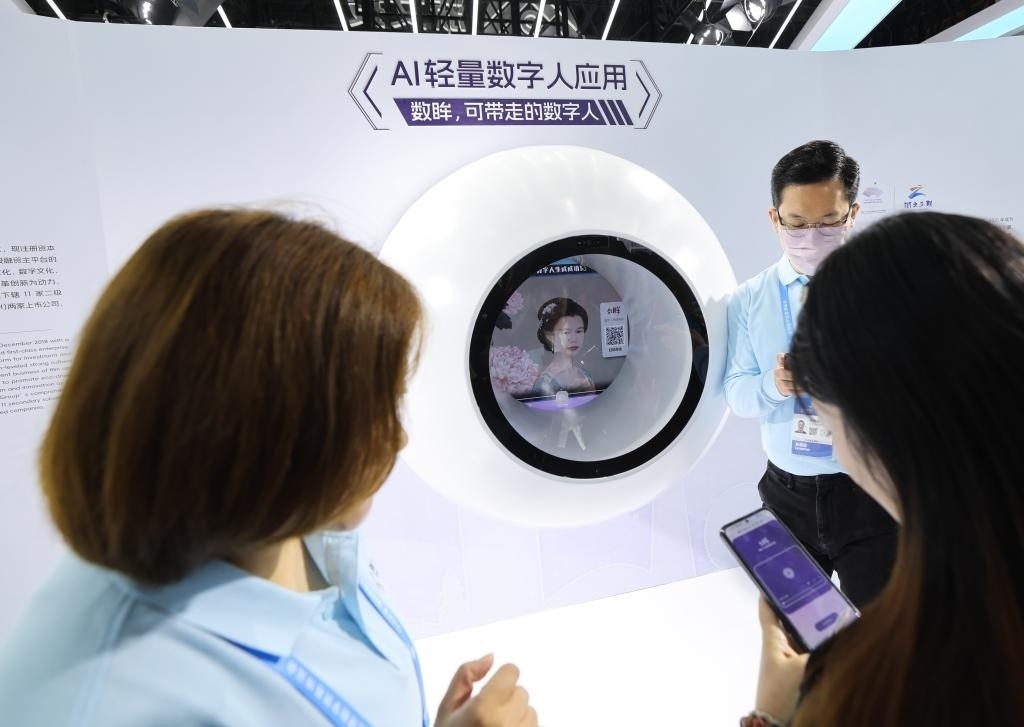 11月23日,參觀者在第二屆全球數(shù)字貿(mào)易博覽會上體驗數(shù)字人應(yīng)用。新華社記者 徐昱 攝