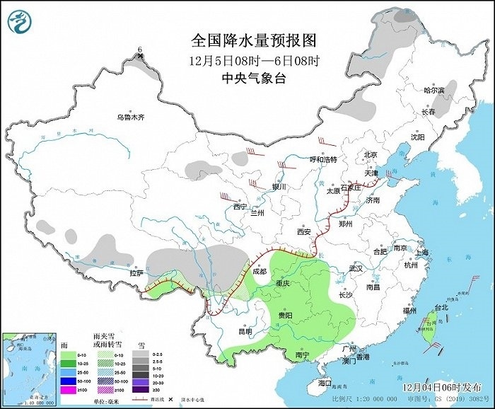 圖1 全國降水量預(yù)報圖(12月4日08時-5日08時)