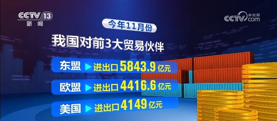 海關(guān)統(tǒng)計數(shù)據(jù)顯示,今年11月份,我國對前3大貿(mào)易伙伴東盟、歐盟、美國分別進出口5843.9億元、4416.6億元、4149億元,合計占我國進出口總值的38.9%;對共建“一帶一路”國家進出口1.72萬億元。同期,我國與拉美、非洲、中亞五國進出口延續(xù)良好態(tài)勢,分別增長9.3%、8.4%、43%。