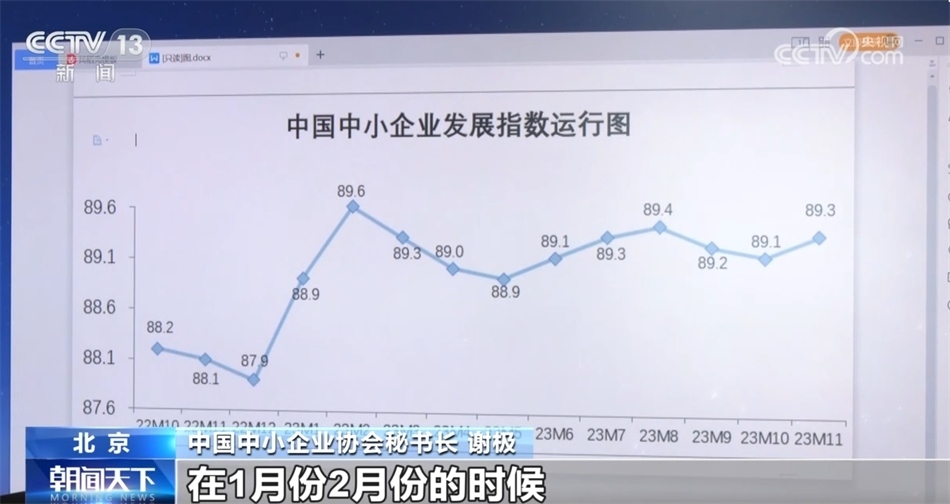 總臺(tái)央視記者 王雷:2023年的中國中小企業(yè)發(fā)展指數(shù)總體呈現(xiàn)出波浪式上升的走勢(shì)。通過對(duì)數(shù)據(jù)的分析,我們還發(fā)現(xiàn),隨著眾多中小企業(yè)加快產(chǎn)業(yè)、產(chǎn)品升級(jí),它們的競(jìng)爭(zhēng)力也在不斷增強(qiáng)。對(duì)比去年11月份和今年11月份的數(shù)據(jù),宏觀經(jīng)濟(jì)感受指數(shù)是分項(xiàng)指數(shù)中升幅最大的,一共上升了2.5點(diǎn)。