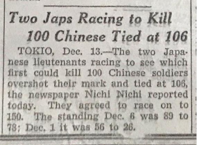 “根據(jù)《東京日日新聞》報(bào)道,兩名日本軍官比賽看誰能先殺死100名中國士兵,結(jié)果都?xì)⒘顺^100人,雙方打平殺了106人,他們又同意重新比賽殺到150人為止,12月6日是89比78,12月1日是56比26?!边@是1937年12月14日發(fā)行的《芝加哥每日論壇》中,一篇有關(guān)兩名日本軍官進(jìn)行“百人斬”殺人競賽的報(bào)道節(jié)選。