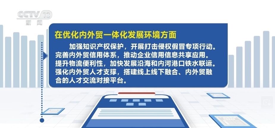 在優(yōu)化內(nèi)外貿(mào)一體化發(fā)展環(huán)境方面,加強(qiáng)知識產(chǎn)權(quán)保護(hù),開展打擊侵權(quán)假冒專項(xiàng)行動(dòng)。完善內(nèi)外貿(mào)信用體系,推動(dòng)企業(yè)信用信息共享應(yīng)用。提升物流便利性,加快發(fā)展沿海和內(nèi)河港口鐵水聯(lián)運(yùn)。強(qiáng)化內(nèi)外貿(mào)人才支撐,搭建線上線下融合、內(nèi)外貿(mào)融合的人才交流對接平臺。