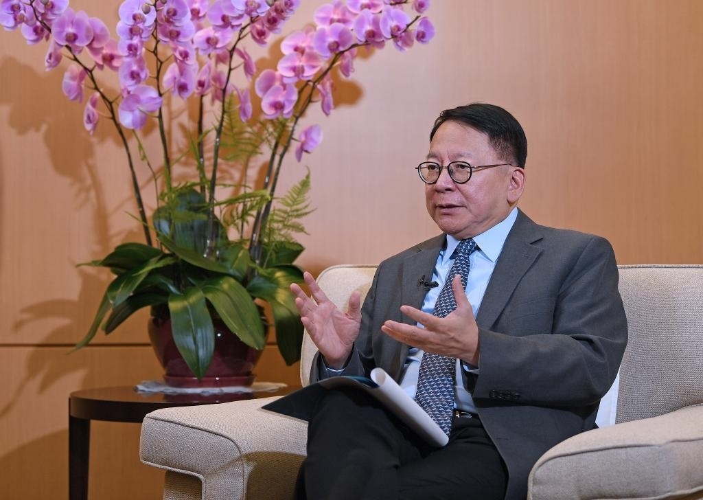 11月27日,香港特區(qū)政府政務(wù)司司長(zhǎng)陳國基接受采訪。新華社記者 陳鐸 攝