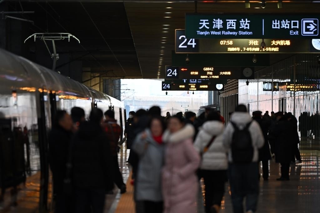 12月18日,G8842次列車停靠在天津西站站臺。新華社記者李然攝