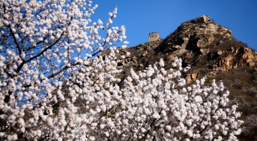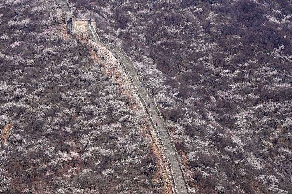 游客在山花遍野的慕田峪長(zhǎng)城景區(qū)參觀游覽(2023年3月29日攝)。