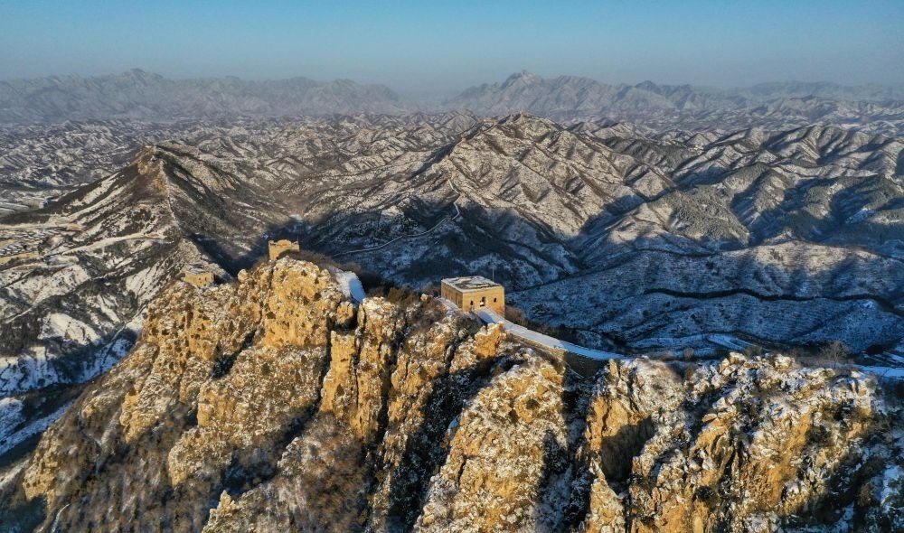 在晨曦中拍攝的雪后司馬臺(tái)長(zhǎng)城(無(wú)人機(jī)照片,2023年2月19日攝)。