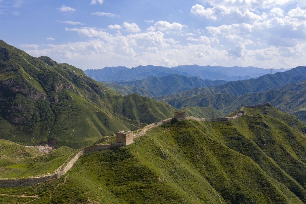河北省遷西縣榆木嶺長(zhǎng)城景色(無(wú)人機(jī)照片,2023年7月9日攝)。