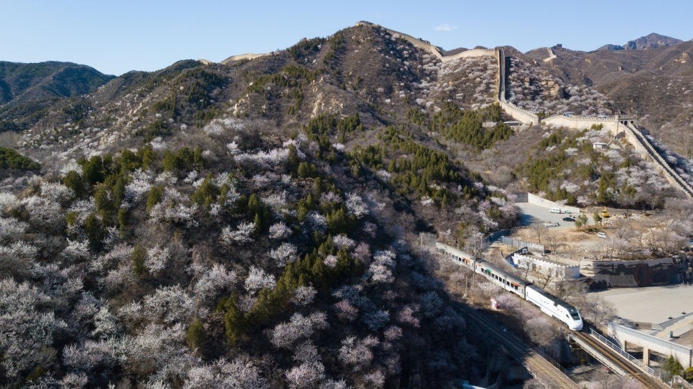 一列火車在北京水關(guān)長(zhǎng)城附近的山花中穿行(無(wú)人機(jī)照片,2020年3月27日攝)。