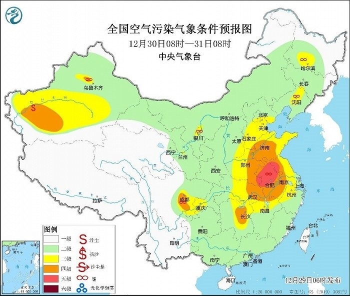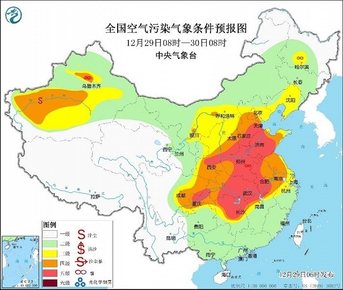 央視網(wǎng)消息:據(jù)中央氣象臺網(wǎng)站消息,12月29日早晨,中央氣象臺將大霧預警升級為最高等級的紅色,這也是今年首次發(fā)布大霧紅色預警。氣象監(jiān)測顯示,今晨,內(nèi)蒙古中部、寧夏北部、陜西、山西、河北中南部、天津、山東、河南、蘇皖中南部、浙江北部和西部、江西北部、湖北、湖南及四川盆地等地出現(xiàn)輕度到中度污染,部分地區(qū)重度污染;上述部分地區(qū)出現(xiàn)能見度不足1千米的大霧,其中河北、山東、安徽、江蘇、浙江及上海等局地能見度不足200米。今天早晨至上午時段,四川盆地至黃淮、江淮一帶的大霧天氣仍會持續(xù)。