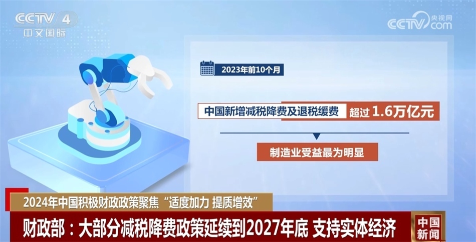 央視網(wǎng)消息:2023年中國(guó)實(shí)施的積極財(cái)政政策有力有效,推動(dòng)經(jīng)濟(jì)實(shí)現(xiàn)了質(zhì)的有效提升和量的合理增長(zhǎng)。記者日前在專訪多位中國(guó)財(cái)政部相關(guān)負(fù)責(zé)人時(shí)了解到,2024年中國(guó)將堅(jiān)持穩(wěn)中求進(jìn)工作總基調(diào),繼續(xù)實(shí)施積極的財(cái)政政策,圍繞“適度加力、提質(zhì)增效”做文章,并積極穩(wěn)妥推進(jìn)稅制改革。《中國(guó)新聞》元旦特別節(jié)目《開年經(jīng)濟(jì)觀察》,今天(1月3日)聚焦“適度加力、提質(zhì)增效”的中國(guó)積極財(cái)政政策。