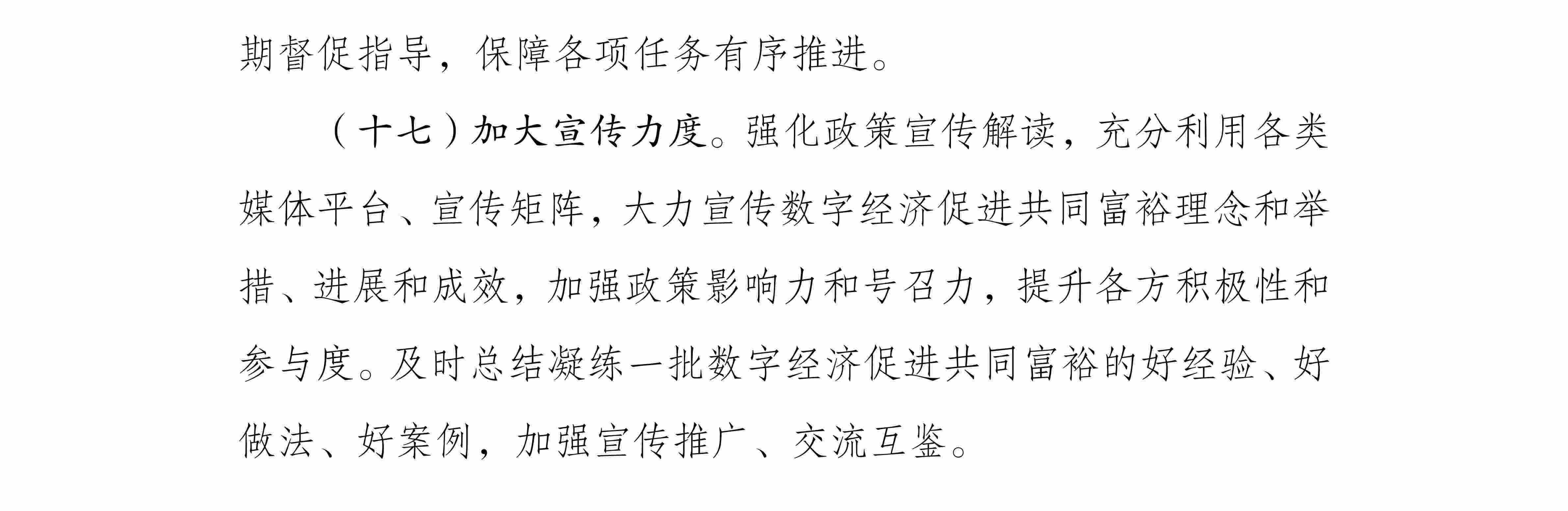 央視網(wǎng)消息:據(jù)國家發(fā)展改革委、國家數(shù)據(jù)局,為全面貫徹黨的二十大精神,按照中央經(jīng)濟(jì)工作會(huì)議部署,推動(dòng)數(shù)字技術(shù)和實(shí)體經(jīng)濟(jì)深度融合,不斷做強(qiáng)做優(yōu)做大我國數(shù)字經(jīng)濟(jì),通過數(shù)字化手段促進(jìn)解決發(fā)展不平衡不充分問題,推進(jìn)全體人民共享數(shù)字時(shí)代發(fā)展紅利,助力在高質(zhì)量發(fā)展中實(shí)現(xiàn)共同富裕,研究制定了《數(shù)字經(jīng)濟(jì)促進(jìn)共同富裕實(shí)施方案》。