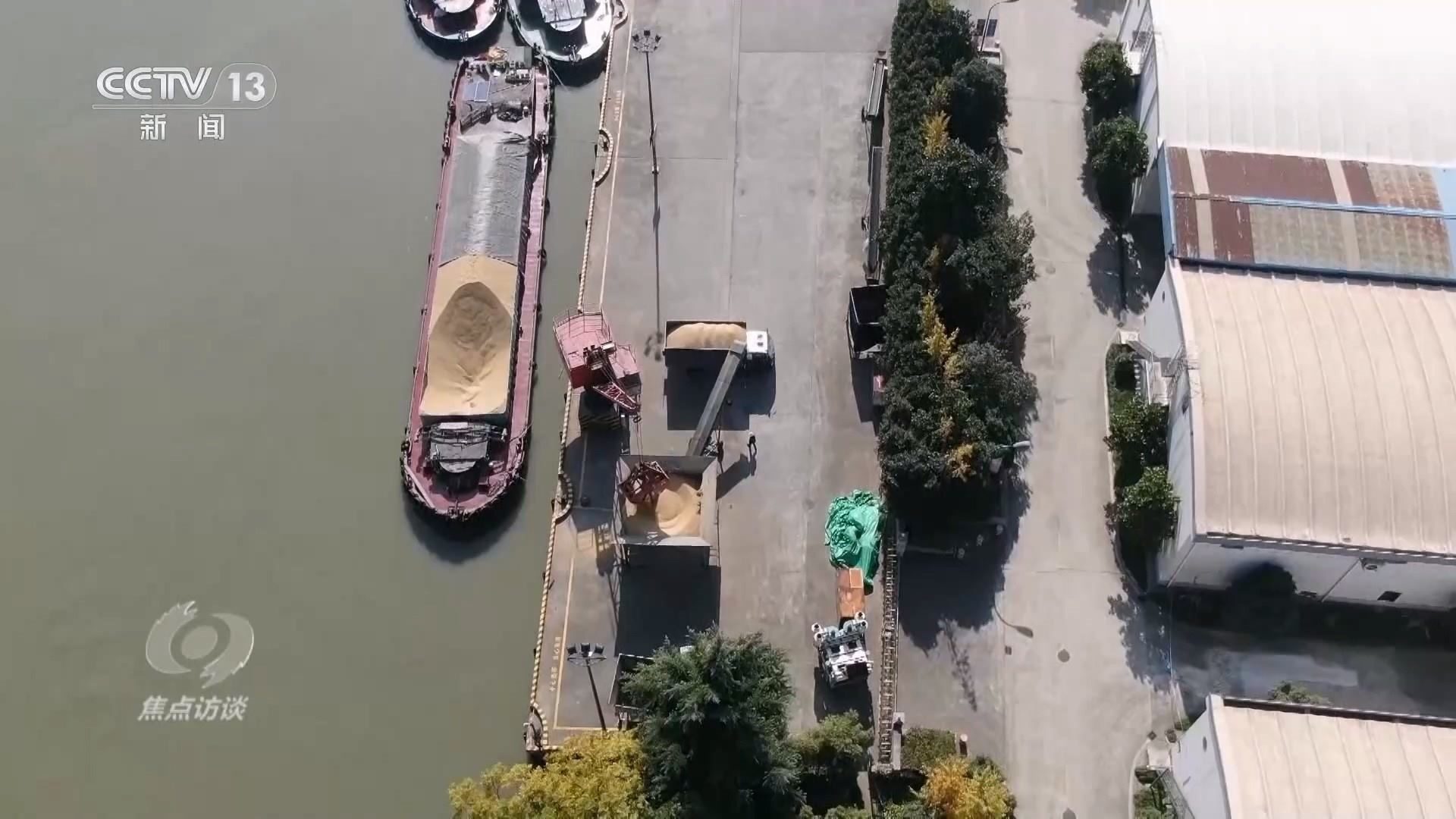 在京杭大運(yùn)河浙江余杭段的這個(gè)碼頭上,貨船上的稻谷正在被轉(zhuǎn)送到貨車上。碼頭旁是浙江省糧食局直屬糧油儲(chǔ)備庫(kù),稻谷將被儲(chǔ)存在這些倉(cāng)庫(kù)里。