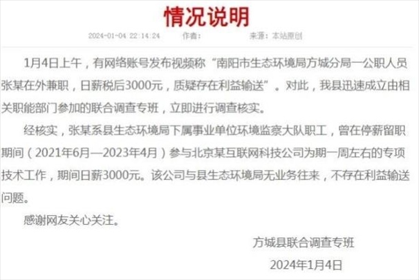 ·南陽調(diào)查“公務(wù)員兼職日薪三千”:停薪留職期間曾參與一周專項技術(shù)工作,不存在利益輸送。