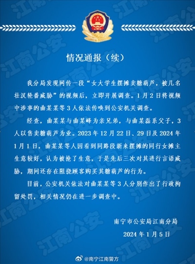 ·廣西南寧警方再通報“女大學(xué)生擺攤賣糖葫蘆被壯漢威脅”:3人被行拘。