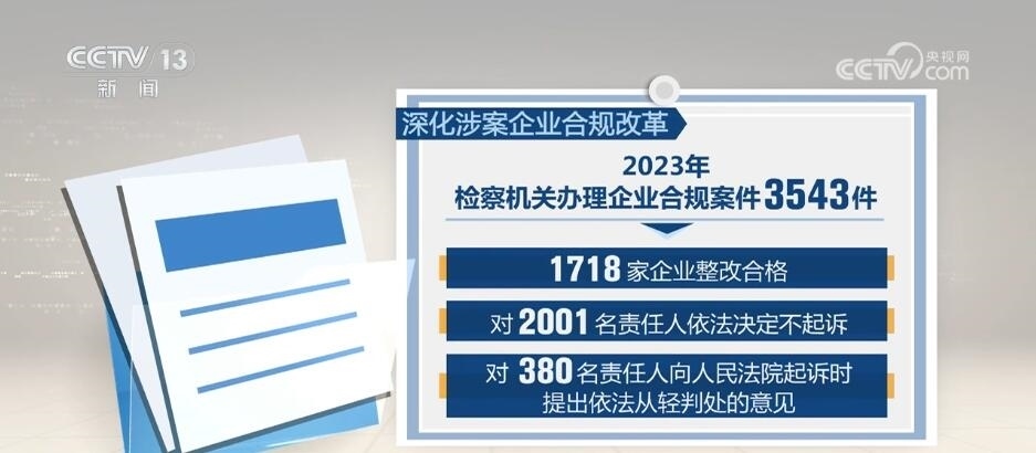 深化涉案企業(yè)合規(guī)改革。2023年檢察機(jī)關(guān)辦理企業(yè)合規(guī)案件3543件,其中1718家企業(yè)整改合格,對(duì)2001名責(zé)任人依法決定不起訴,對(duì)380名責(zé)任人向人民法院起訴時(shí)提出依法從輕判處的意見。加強(qiáng)知識(shí)產(chǎn)權(quán)綜合司法保護(hù)。審查起訴侵犯知識(shí)產(chǎn)權(quán)犯罪案件2.8萬人,同比上升53.3%;受理知識(shí)產(chǎn)權(quán)民事行政訴訟監(jiān)督案件2240件,同比增長1.7倍。持續(xù)加大對(duì)信息技術(shù)、生物醫(yī)藥、新能源等高科技領(lǐng)域知識(shí)產(chǎn)權(quán)保護(hù)力度。針對(duì)涉知識(shí)產(chǎn)權(quán)惡意訴訟、惡意侵權(quán)多發(fā)問題,持續(xù)組織開展專項(xiàng)監(jiān)督,促進(jìn)營造良好創(chuàng)新生態(tài)。
