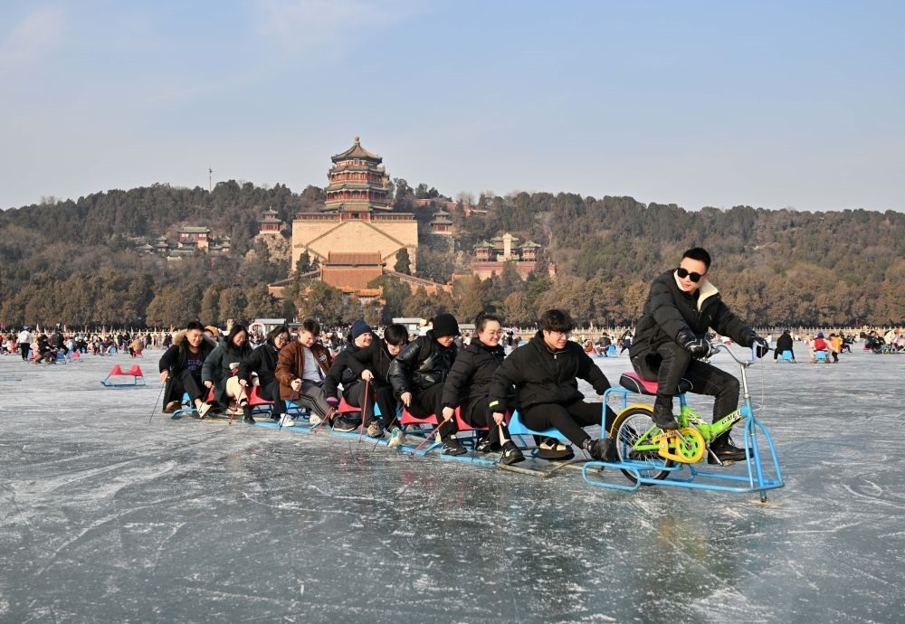 2024年1月1日,游客在北京頤和園冰場(chǎng)玩冰車和冰上自行車。新華社記者 陳曄華 攝