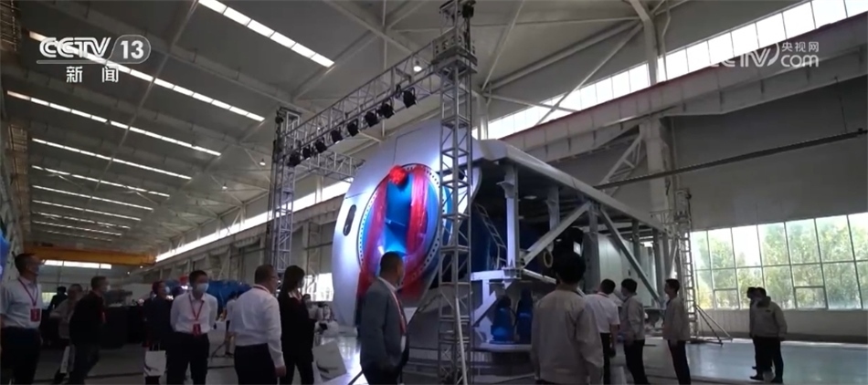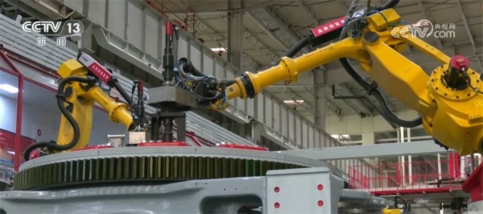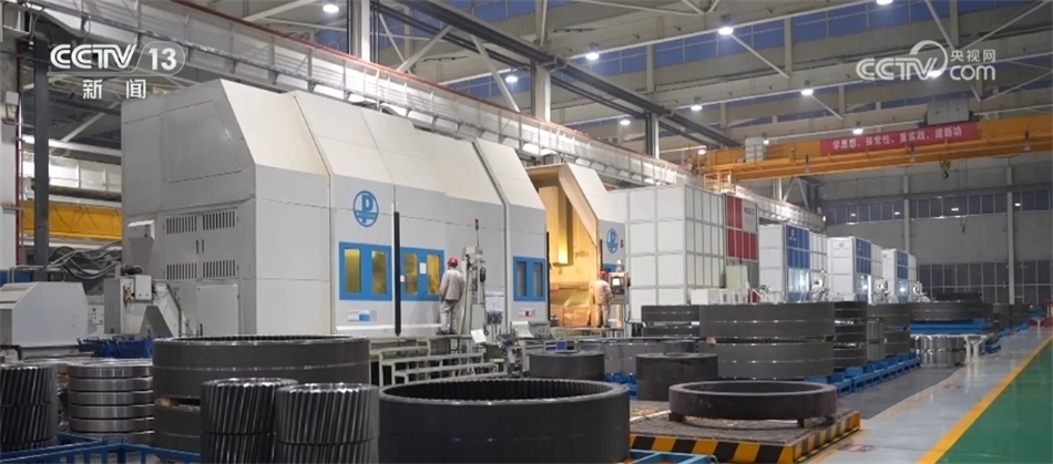 總臺(tái)央視記者 古峻嶺:這個(gè)大家伙叫輪轂,就是風(fēng)機(jī)葉輪中間這個(gè)位置,就是它把重達(dá)百?lài)嵉?支葉片牢牢固定在風(fēng)機(jī)之上。采用傳統(tǒng)人工的方式,需要2個(gè)人花上180分鐘才能安裝完,現(xiàn)在只需要80分鐘即可完成。傳統(tǒng)定點(diǎn)裝配模式一天只能裝配3—4臺(tái)主機(jī),而在現(xiàn)在的流水線(xiàn)上作業(yè),一天則可以裝配6—8臺(tái)主機(jī),效率翻倍,但是用工卻減少了一半。