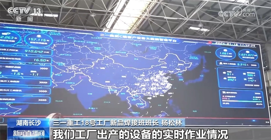 三一重工18號(hào)工廠新品焊接班班長(zhǎng) 楊松林:來(lái)我們“燈塔工廠”參觀,我們都會(huì)看到一個(gè)超級(jí)大的屏幕,每一個(gè)閃光點(diǎn)都代表著我們工廠出廠的設(shè)備的實(shí)時(shí)作業(yè)情況。這些閃光點(diǎn)最后就形成了一個(gè)三一的挖掘機(jī)指數(shù),就相當(dāng)于我們業(yè)內(nèi)工程行業(yè)的一個(gè)晴雨表,其實(shí)我們還是挺自豪的。
