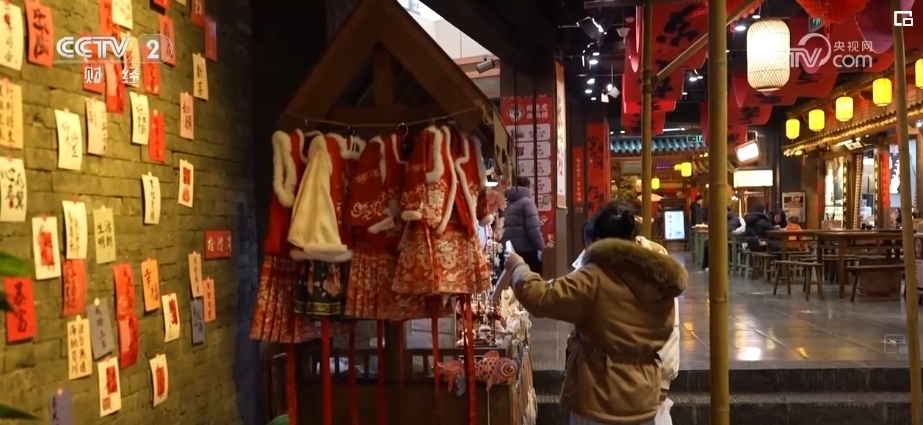 在中國人的習俗中,過年少不了趕集。長沙在宋朝時被稱作潭州,是重要的商業(yè)中心之一。在宋風市井文化體驗地潭州市集,春聯(lián)、龍燈等裝飾,吸引了不少游客。