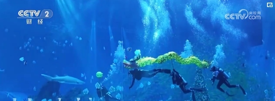 在鄭州一家海洋主題公園,4名潛水員化身“舞龍高手”,伴隨著他們的一招一式,一條金龍在水中騰挪起伏,向人們傳遞萬物生輝的新春祝福。
