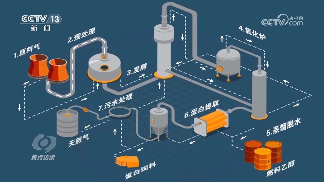 河北首朗新能源科技有限公司副總經(jīng)理楊艷:“首先工業(yè)尾氣通過管道輸送到氣體預處理工段,經(jīng)過簡單的壓縮和煤氣凈化,由管道輸送到核心發(fā)酵工段,氣體從發(fā)酵罐的底部進入到頂部,單程只有幾十秒的時間。”