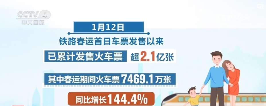 自1月12日鐵路春運(yùn)首日車(chē)票發(fā)售以來(lái),已累計(jì)發(fā)售火車(chē)票超2.1億張。其中,春運(yùn)期間火車(chē)票7469.1萬(wàn)張,同比增長(zhǎng)144.4%。為滿足旅客旺盛的出行需求,全國(guó)鐵路統(tǒng)籌新線與既有線路、高鐵與普速鐵路,啟用春運(yùn)列車(chē)運(yùn)行圖,加大客運(yùn)能力投放。