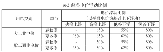 ?。ㄈ┱{(diào)整峰谷電價(jià)浮動(dòng)比例,具體見表2。浮動(dòng)比例以平段電價(jià)為基礎(chǔ),平段電價(jià)包含上網(wǎng)電價(jià)、上網(wǎng)環(huán)節(jié)線損費(fèi)用、系統(tǒng)運(yùn)行費(fèi)用、輸配電價(jià)(不含容(需)電價(jià))、政府性基金及附加。