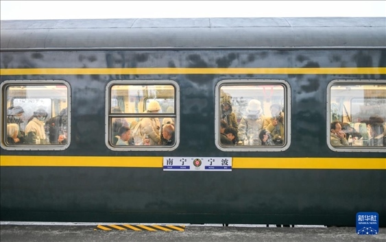 1月26日,在湖南省永州市道縣道州站,乘客在T582次列車上等候發(fā)車。新華社發(fā)(蔣克青攝)