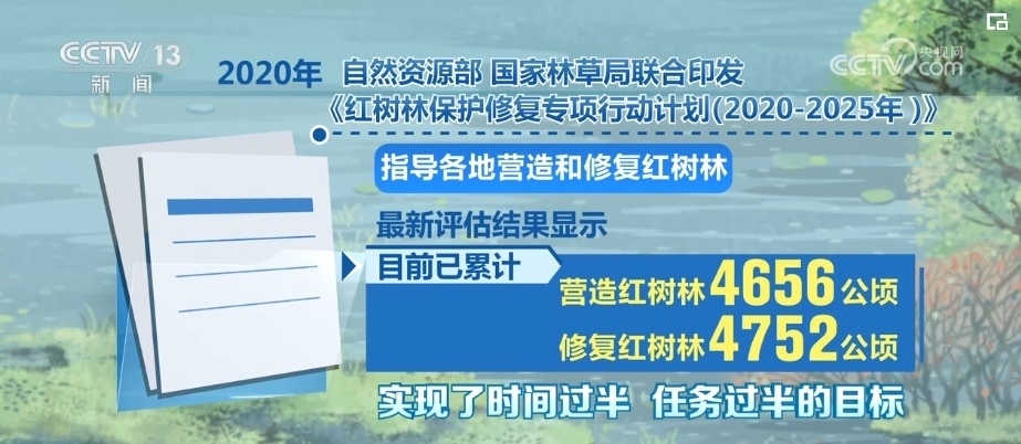 2020年,自然資源部、國家林草局聯(lián)合印發(fā)《紅樹林保護(hù)修復(fù)專項(xiàng)行動計(jì)劃(2020—2025年)》,指導(dǎo)各地營造和修復(fù)紅樹林。最新評估結(jié)果顯示,目前,已累計(jì)營造紅樹林4656公頃,修復(fù)紅樹林4752公頃,實(shí)現(xiàn)了時(shí)間過半、任務(wù)過半的目標(biāo)。