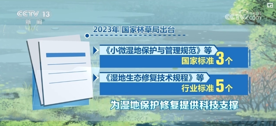 2023年,國家林草局出臺《小微濕地保護(hù)與管理規(guī)范》等國家標(biāo)準(zhǔn)3個(gè)、《濕地生態(tài)修復(fù)技術(shù)規(guī)程》等行業(yè)標(biāo)準(zhǔn)5個(gè),為濕地保護(hù)修復(fù)提供科技支撐。