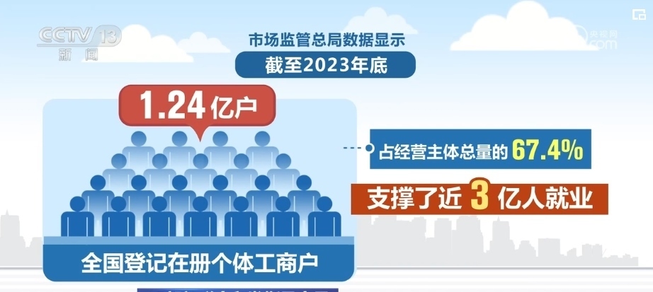 市場監(jiān)管總局?jǐn)?shù)據(jù)顯示,截至2023年底,全國登記在冊個體工商戶1.24億戶,占經(jīng)營主體總量的67.4%,支撐了近3億人就業(yè)。