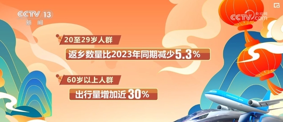 根據中國聯通智慧足跡對出行人群年齡的分析,2024年“反向春運”成為新趨勢。數據顯示,20歲—29歲人群的返鄉(xiāng)數量比2023年同期減少了5.3%,而60歲以上人群的出行量卻增加了近30%。