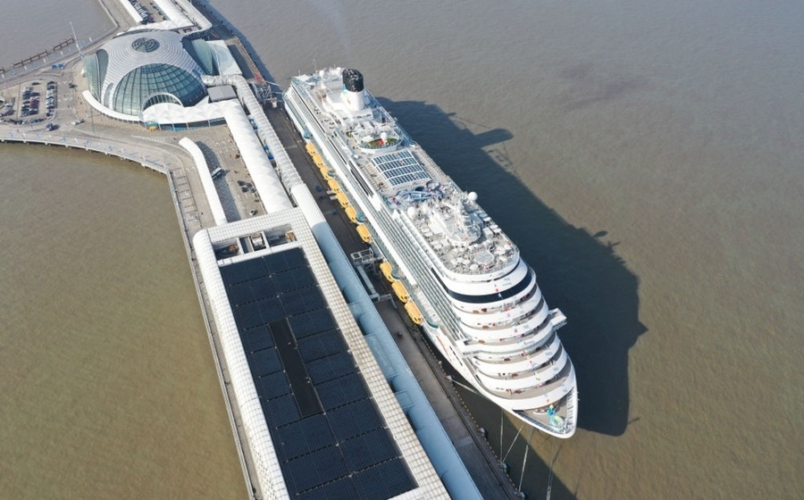 2024年1月1日,“愛達(dá)·魔都號”在上海吳淞口國際郵輪港正式開啟商業(yè)首航。這是郵輪??吭谏虾卿量趪H郵輪港(無人機(jī)照片)。新華社記者 丁汀 攝