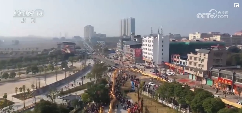 2月10日上午,在廣東韶關南雄市珠璣古巷,一場盛大的九十九節(jié)龍巡游熱鬧上演。九十九節(jié)龍的龍頭由五種顏色繪制,兩額長著長角、兩邊附有魚鱗片,金光閃閃、色彩鮮艷,龍首龍尾還粘有九十九朵長壽之花。它在珠璣古巷內(nèi)巡游,為父老鄉(xiāng)親祈福,并分別在珠璣牌坊、百姓堂列隊,用龍身擺出“龍年大吉”“天下太平”的新年祝福。
