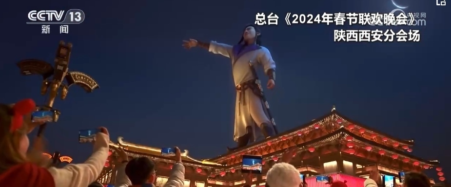 除夕當(dāng)晚9時(shí),西安分會(huì)場(chǎng)《山河詩(shī)長(zhǎng)安》篇章的“打開(kāi)方式”讓人眼前一亮。在科技助力下,“詩(shī)仙”李白跨越歲月長(zhǎng)河“穿越”而來(lái),在煙火璀璨中,隨著熙熙攘攘的人群一起走進(jìn)西安城墻永寧門,走入千年后的耀眼長(zhǎng)安。