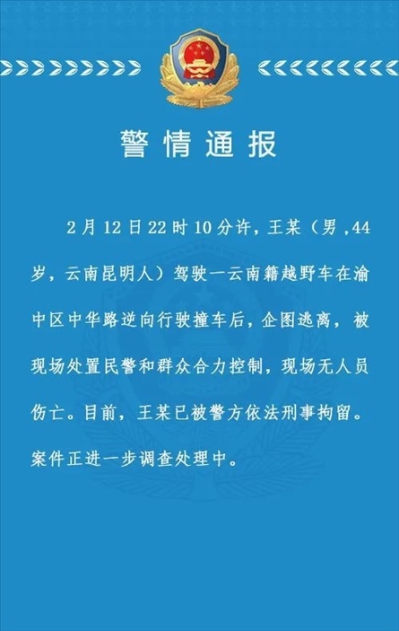·重慶解放碑一男子駕車逆行撞車后企圖逃離被刑拘,警方通報(bào)。