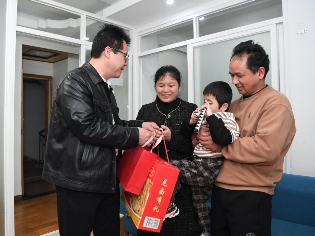 王永澄(左一)在福州市鼓樓區(qū)紅墻巷小區(qū)為盲人家庭送來新春慰問(2月18日攝)。