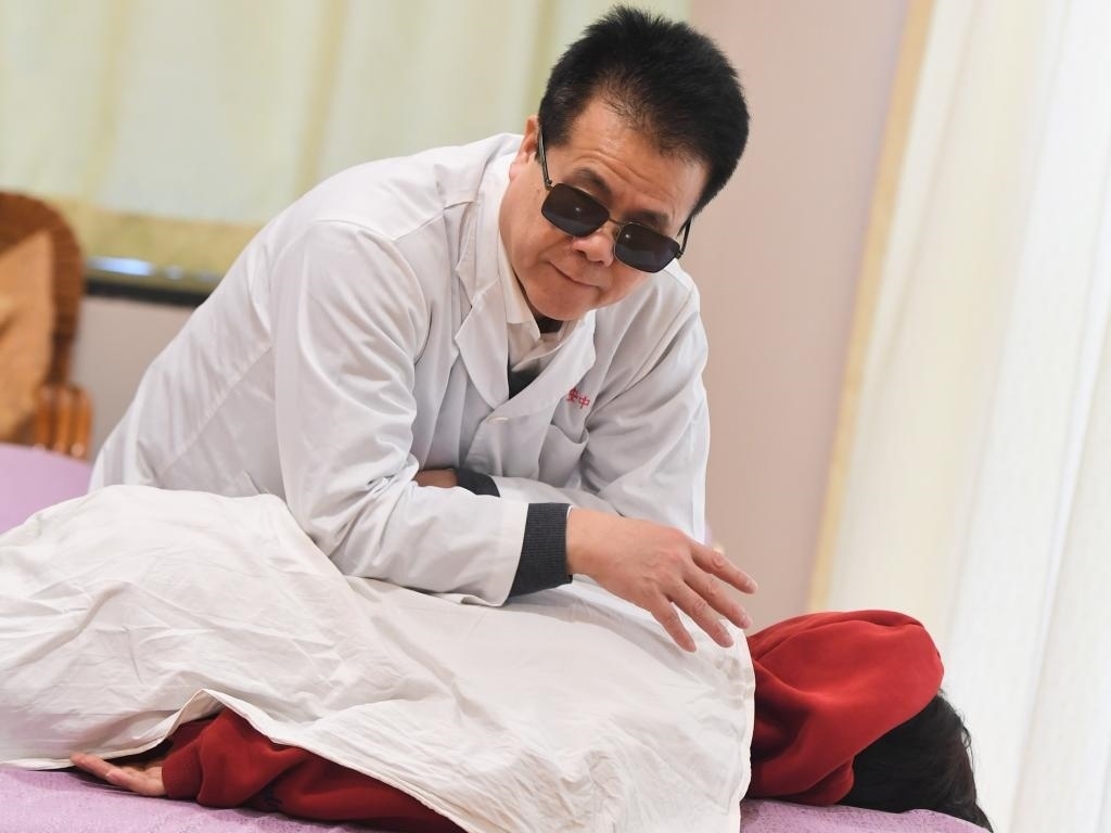 王永澄在福州市海峽盲人按摩指導(dǎo)中心為盲人朋友演示盲按手法(2月6日攝)。