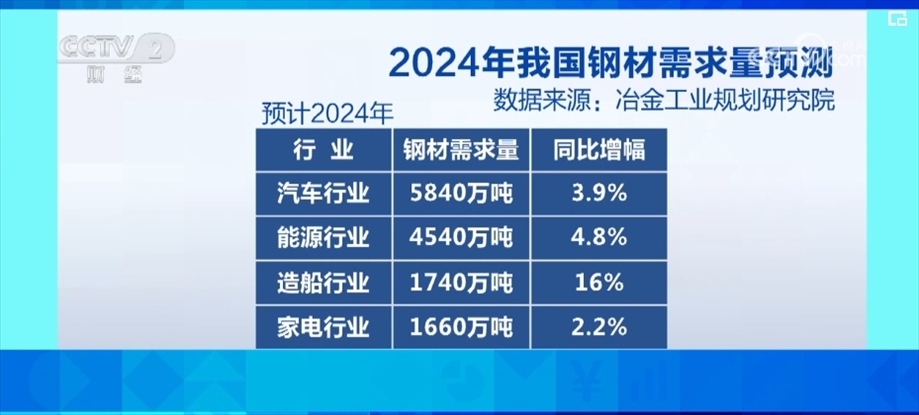 根據(jù)冶金工業(yè)規(guī)劃研究院的綜合預(yù)測,2024年,我國鋼材需求量為8.75億噸。從下游行業(yè)消費來看,預(yù)計2024年,汽車行業(yè)的鋼材需求為5840萬噸,同比增長3.9%;能源行業(yè)的鋼材需求為4540萬噸,同比增長4.8%;造船行業(yè)的鋼材需求為1740萬噸,同比增長16%;家電行業(yè)的鋼材需求為1660萬噸,同比增長2.2%。