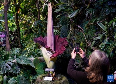 美國(guó)舊金山加州科學(xué)博物館內(nèi)一株開(kāi)花的巨魔芋吸引大批游客觀賞。巨魔芋原產(chǎn)于印度尼西亞蘇門(mén)答臘島的熱帶雨林,每隔7至10年開(kāi)花一次,每次開(kāi)花時(shí)間只有24至36個(gè)小時(shí)。
