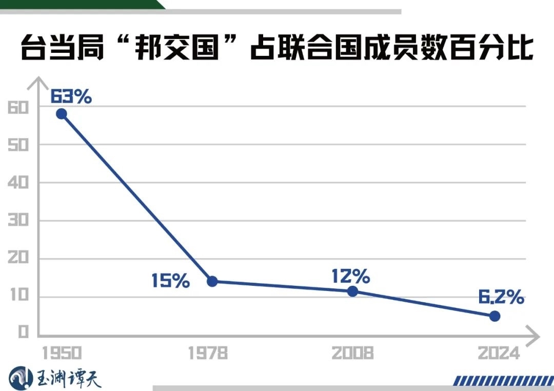 可以看到,1950年,臺灣當局“邦交國”數(shù)量占聯(lián)合國成員國數(shù)量的比例,還高達63%。