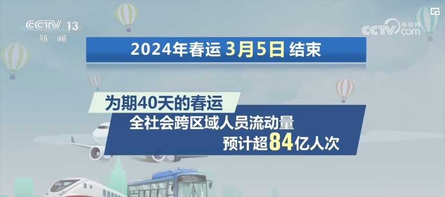 2024年春運(yùn)3月5日結(jié)束,為期40天的春運(yùn)全社會(huì)跨區(qū)域人員流動(dòng)量預(yù)計(jì)超84億人次。其中,鐵路客運(yùn)量預(yù)計(jì)完成4.8億人次;公路人員流動(dòng)量預(yù)計(jì)完成78.3億人次,其中,高速公路及普通國省道非營業(yè)性小客車人員出行量預(yù)計(jì)完成67.2億人次,在全社會(huì)跨區(qū)域人員流動(dòng)量中占比約80%,公路營業(yè)性客運(yùn)量預(yù)計(jì)完成11.1億人次;水路客運(yùn)量預(yù)計(jì)完成2900萬人次;民航客運(yùn)量預(yù)計(jì)完成8300萬人次。