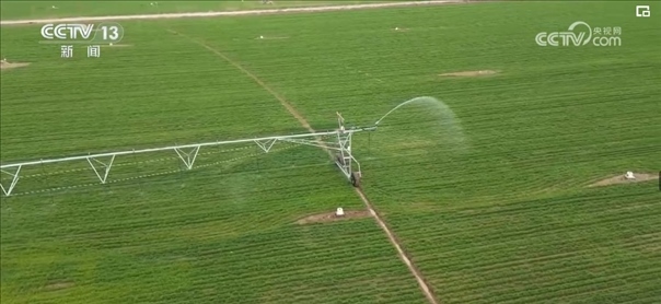 根據(jù)農(nóng)業(yè)專家的精準測算和調(diào)度,園區(qū)工作人員啟動了大型指針式噴灌機。