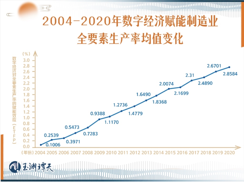 有學(xué)者做過(guò)測(cè)算,從2004年開始到2021年,數(shù)字經(jīng)濟(jì)賦能制造業(yè)全要素生產(chǎn)率效能呈逐年上升的趨勢(shì),且近年來(lái),賦能均值達(dá)到了最高點(diǎn)。