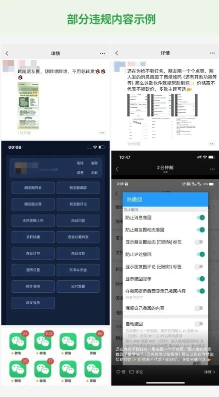 3月26日,微信安全中心發(fā)布《針對(duì)在微信使用“外掛”行為的打擊公告》,《公告》指出,根據(jù)《微信個(gè)人賬號(hào)使用規(guī)范》規(guī)定,微信明確禁止使用各類“外掛”。但近期發(fā)現(xiàn),有部分用戶存在多次違規(guī)使用“外掛”軟件,或在朋友圈發(fā)布“外掛”售賣信息的行為。對(duì)此,微信安全團(tuán)隊(duì)進(jìn)行了專項(xiàng)清理,并將持續(xù)加大清理力度。