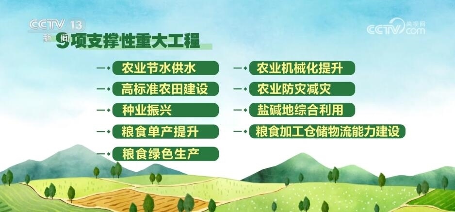 與此同時,《方案》還圍繞糧食生產(chǎn)的關鍵領域和薄弱環(huán)節(jié),謀劃部署了農(nóng)業(yè)節(jié)水供水、高標準農(nóng)田建設、種業(yè)振興、糧食單產(chǎn)提升、糧食綠色生產(chǎn)、農(nóng)業(yè)機械化提升、農(nóng)業(yè)防災減災、鹽堿地綜合利用、糧食加工倉儲物流能力建設等9項支撐性重大工程。