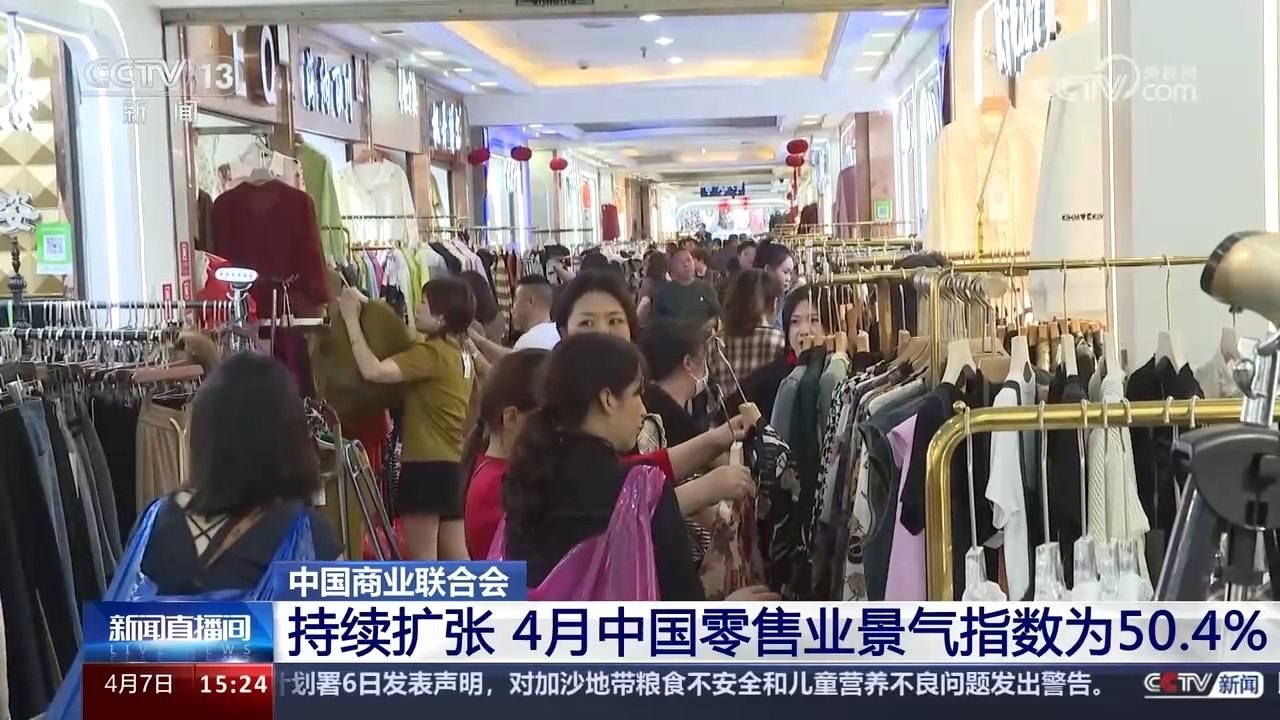 央視網(wǎng)消息:中國商業(yè)聯(lián)合會最新發(fā)布的中國零售業(yè)景氣指數(shù)顯示,4月份,中國零售業(yè)景氣指數(shù)為50.4%,連續(xù)一年維持在擴(kuò)張區(qū)間。全國商品經(jīng)營類企業(yè)對4月份盈利增長恢復(fù)的預(yù)期開始好轉(zhuǎn)。