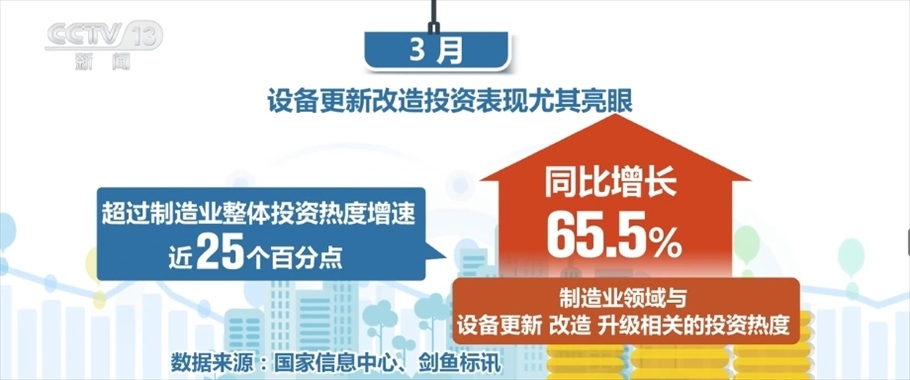 制造業(yè)領(lǐng)域則更為突出,1—2月,制造業(yè)投資熱度指數(shù)同比增長13.3%,3月迅速提升至40.6%,遠(yuǎn)高于全國總體投資熱度增速。設(shè)備更新改造投資表現(xiàn)尤其亮眼,3月,制造業(yè)領(lǐng)域與設(shè)備更新、改造、升級相關(guān)的投資熱度同比增長65.5%,超過制造業(yè)整體投資熱度增速近25個百分點。