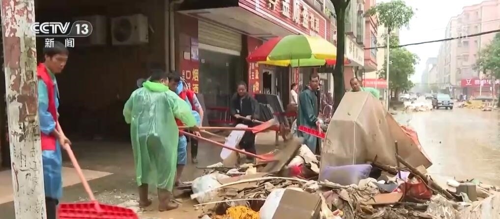 在清遠英德市浛洸鎮(zhèn),被浸了兩天多的鎮(zhèn)區(qū)已經(jīng)全部退水,當(dāng)?shù)亟M織黨員干部投入清淤工作,同時加緊時間進行清洗和消殺。